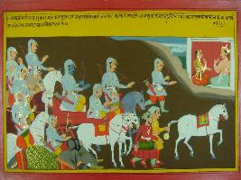 | Description / विवरण | Miniature painting based on Mahabharat - Ashwamegh parva depicting Arjun with his army going after Neeldhwaja, the sacrificial horse to meet Ulmuk who is saying Arjun that god will help him. |