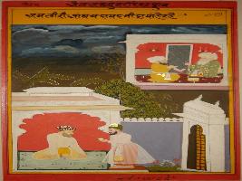 | Description / विवरण | Miniature painting based on Mullah-do-Piyaja depicting Mullah-do-Piyaja telling Akbar that one who consumes opium always remain in dreams and his eyes always remains half closed. |