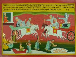 | Description / विवरण | Miniature painting based on Mahabharat - Ashwamegh parva depicting that Arjun and Shikhandi is fighting with Bhishma and Bhishma is badly wounded by Arjun while the lower part depicts Devi Ganga. |