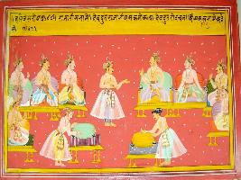 | Description / विवरण | Miniature painting based on Harivansha depicting a devdoot talking to eight seated kings -four at either side. |