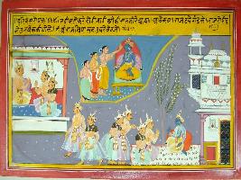 | Description / विवरण | Miniature painting based on Harivansha depicting a king seated and talking to two men. Those two men are talking to seated Krishna in his palace. In the middle top the coronation scene of Krishna is depicted. |