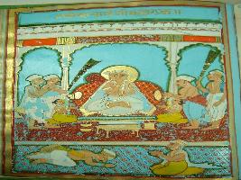 | Description / विवरण | Miniature painting depicting Shri Acharyaji avatar sitting on throne and three follower are seen in both side of him while two males are depicted in the lower part of the painting. |