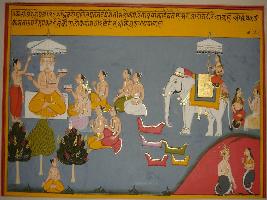 | Description / विवरण | Miniature painting based on Kashi khand depicting Dhruv worshipping to lord Brahma along with some devotees. At the upper left part a lady is seated on elephant under Chhatri. Nagpurush and Nagkanya seated around the left lower corner. |