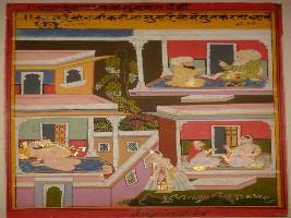 | Description / विवरण | Miniature painting based on Mullah-do-Piyaja depicting Mullah-do-Piyaja talking to Akbar. On the lower part is the depiction of a mating scene and two women are depicted talking to each other. |