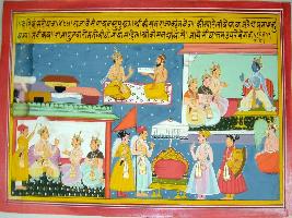 | Description / विवरण | Miniature painting based on Harivansha depicting a king talking to two men, then all the three are seen seated and talking to Krishna. In the lower left attendants are standing around an empty throne. |