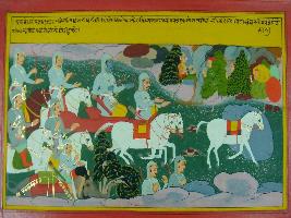 | Description / विवरण | Miniature painting based on Mahabharat - Ashwamegh parva depicting the sacrificial horse Neeldhwaja going ahead and reached Vindhyanchal. Arjun and other Pandavas are following the horse. |