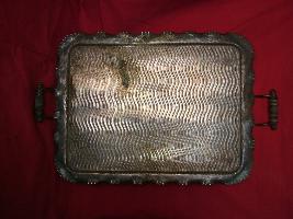 | Description / विवरण | This is a brass coloured tray. It has engraved wavy vertical line pattern and two handles on both sides. |