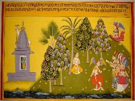| Description / विवरण | Miniature painting based on Kashi khand depicting Dhruv in Dhyanamudra and apsara, fairy of lord Indra dancing in front of him, for disturbing his penance. On the right of the painting lord Vishnu s temple seen. |