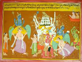| Description / विवरण | Miniature painting based on Harivansha depicting battle between Lord Vishnu and a multi-headed and multi-armed demon. Lord Vishnu is seated on Garuda. In the left side, many demons are attacking them together and Garuda has been beaten. |