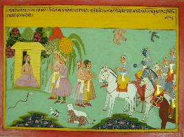 | Description / विवरण | Miniature painting based on Mahabharat - Ashwamegh parva depicting Arjun with his army visiting ashram of a sage on his way. Many animals such as snake, cow, tiger are seen living peacefully in the ashram. |