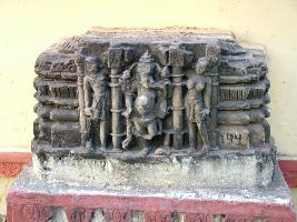 | Description / विवरण | This is an sculpture of Lord Ganesha shown in pratyalidha posture. Four armed god with his attributes, uncleared only flower is seen in one hand while in othe a goad . Remarkably his trunk tusk is shown resting on a lady figure. He is flanked by two female attendants. |