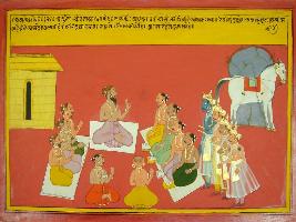 | Description / विवरण | Miniature painting based on Mahabharat - Ashwamegh parva depicting Arjun, Jovanashrava, Brishketu, Satyaki and Pradyuman are shown going to Saurabh rishi s ashram and asking Saurabh sage the reason of freeing the sacrificial horse. |
