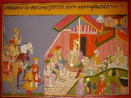 | Description / विवरण | Miniature painting based on Prithviraj Raso. Prithviraj Chauhan is depicted in a camp, with his nobles, some peoples are depicted making food, and three men are depicted sitting on horse outside the camp. |