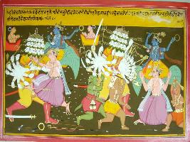 | Description / विवरण | Miniature painting based on Harivansha depicting the vigorous fight between Vishnu and a multi headed and multi armed demon. Two gods are seen worshipping Vishnu. |