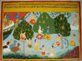 | Description / विवरण | Miniature painting based on Kashi khand depicting a forest called Madhuban. Krishna is depicted sitting with Balram and other friends and animals two snakes are depicted in a river. |