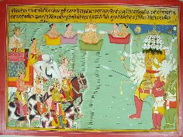 | Description / विवरण | Miniature painting based on Harivansha depicting fight between Indra and other Gods with multi headed and multi-armed Ravan. On the upper part Brahma with other gods on viman are depicted. |