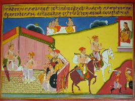 | Description / विवरण | Miniature painting based on Prithviraj Raso depicting the king talking with his officials and sending two officials to Kannauj, while Indra is seen with three other Devtas in the upper part of the painting. A fighting scene is seen in the lower left corner. |