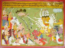 | Description / विवरण | Miniature painting based on Harivansha depicting battle between Gods, lead by Indra and demons, lead by multiheaded and multi-armed Ravan. |