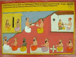 | Description / विवरण | Miniature painting based on Mahabharat - Ashwamegh parva depicting wife of Udalak sage wants to perform shradh and sage is telling her the rules and time of performing shradh . |