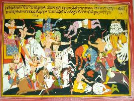 | Description / विवरण | Miniature painting based on Harivansha depicting battle between Devtas and demons. Indra, Vishnu and other gods are seen fighting with a demonical army lead by a multi headed and armed demon. |