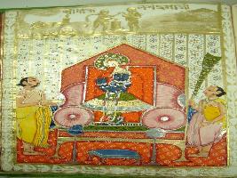 | Description / विवरण | Miniature painting depicting Shri Gourlab Chandrama ji in standing position flanked by two priests. |