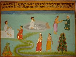 | Description / विवरण | Miniature painting based on Sanskrit drama - Prabodh Chandrodaya depicting Santosh giving daan to a man, at the lower left, a Brahman is shown leaving with Vedavati. At the extreme right a man is shown writing and other man is sitting in front of him with folded hands. To its left, a man is shown sitting. |