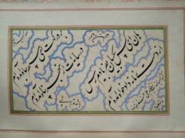 | Description / विवरण | Writer Abdul writes about self-satisfaction in the Persian language. The sheet is decorated with cloud motifs with a lining border. |