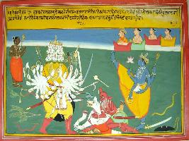 | Description / विवरण | Miniature painting based on Harivansha depicting multi-armed and multi-headed demon on the right side of the painting, while Lord Vishnu standing in Trivikram Mudra on the left side. Indra and other gods sitting on viman are watching them from the sky. |