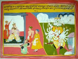 | Description / विवरण | Miniature painting based on Harivansha depicting a demon called Koalnami. On the right side a king is depicted with a prisoner, a soldier and a musician. This person tells about the demon that his face looks like sun, his body like a mountain, with multi-hands and holding many weapons. |