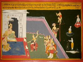 | Description / विवरण | Miniature painting based on Prithviraj Raso depicting court of Prithviraj where he is enjoying dance and music, being performed by some women and acrobats. |