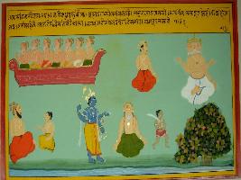 | Description / विवरण | Miniature painting based on Kashi khand depicting Manu reciting Brahma and Brahma revealing himself and fulfilling Manu s wish. Rishis are shown seated on viman at the upper right part. Dhruv is talking to a rishi. |