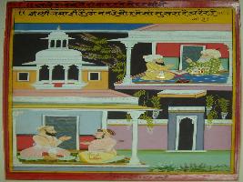 | Description / विवरण | Miniature painting depicting Akbar talking to Mullah-do-Piyaja and telling him that the person who stays in his wife s house is shamless and all men criticise him. |