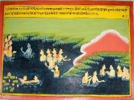 | Description / विवरण | Miniature painting based on Harivansha depicting Krishna bathing with gopis in the river in the right side and in the left part, kings are bathing with the queens. |
