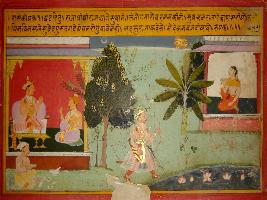 | Description / विवरण | Miniature painting based on Prithviraj Raso depicting Prithviraj praising the beauty of Sanjogita. |