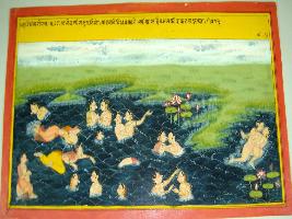 | Description / विवरण | Miniature painting based on Harivansha depicting scenes of loving, union of couples in river. |