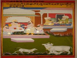 | Description / विवरण | Miniature painting based on Mullah-do-Piyaja. It depicts Mullah-do-Piyaja is telling Akbar that relation between brother as healthy as calves are become healthy after talking their mothers milk. |