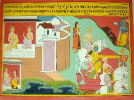 | Description / विवरण | Miniature painting based on Harivansha depicting two seated king talking to each other. A man is talking with a lady below. In left top Vishnu is shown killing a demon. In the lower part, Krishna and Balram are seated on chariot and moving with other horsemen. |