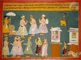 | Description / विवरण | Miniature painting based on Prithviraj Raso depicting Prithviraj receiving Karan, who has coming from Jaichand s palace. Prithviraj asking him about a murder at Kannauj. It also depict Prithviraj and Jaichand in the left corner of the painting. |