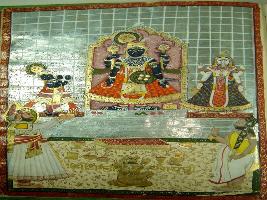 | Description / विवरण | Miniature painting depicting Shri Jagannath ji where Krishna is seen towards its right side and his seen towards it right side and his Shakti is seen in his left side while a king and a priests is seen offering homage to Jagannath ji and Garuda is seen in the centre. |
