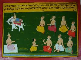 | Description / विवरण | Miniature painting based on Kashi khand depicting Dhruv sitting with Saptarishis. He is telling them about himself that he is Dhruv and took birth for worshipping Shiv. His father thrown out him from home and now Vishnu placed him in sky due to his devotion towards Shiv. |