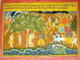 | Description / विवरण | Miniature painting based on Harivansha depicting a scene of Vrindavan, Krishna is herding cows along with his friends. He is shown playing with flute under a tree. Lotus blooms are seen in the river. |
