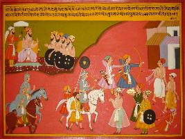 | Description / विवरण | Miniature painting based on Prithviraj Raso depicting conversation between Jaichand and poet Chandvardai who is saying that Prithviraj conquered the whole world that s why the Jaichand is afraid of him. At the upper right corner Mohammad Ghauri discussing with his four ministers - Tatarkha, Shurshan Khan, Sharusatam and Kalanganiya. |
