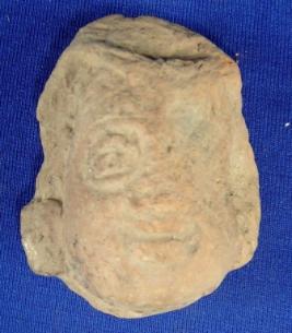 | Description / विवरण | Terracotta human head. The right eye is damaged, nose and lips are prominent. It is wearing round earrings. |