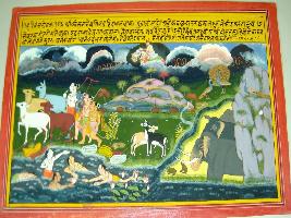 | Description / विवरण | Miniature painting based on Harivansha depicting scene of forest, clouds laden with rain, peacock, deer, elephants. Krishna Hari along with his friends herding the cows. Some of his friends are swimming in the river and playing in it. |