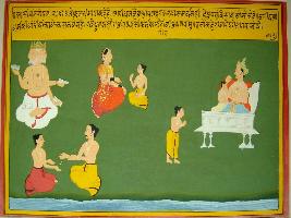 | Description / विवरण | Miniature painting based on Kashi khand. On one side Brahma is depicted on the middle child and mother is depicted and on other side father with son walking on the bank of river Ganga is depicted. |