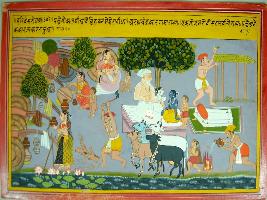 | Description / विवरण | Miniature painting based on Harivansha depicting different activities of Gokul like, cow herding, cutting woods, making of roof with leaves and mother with child. Under a tree Krishna and Balram is seen with Nanda. |