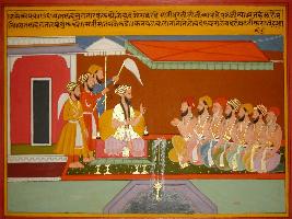| Description / विवरण | Miniature painting based on Prithviraj Raso depicting conversation between emperor Ghauri, Tatarkha and other ministers. Emperor making conspiracy against Jaichand and ordering Tatarkha to attack on Kannauj so that the power of Jaichand will decrease. |
