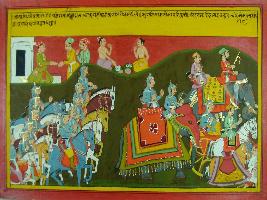 | Description / विवरण | Miniature painting based on Mahabharat - Ashwamegh parva depicting a huge army headed by Sugati and he is assisted by Neeldhwaja s son Chandraketu while on top king Neeldhwaja is seen donating money to Brahmans. |