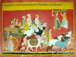 | Description / विवरण | Miniature painting based on Harivansha depicting Nanda, Shri Krishna and other villagers going towards Vrindavan. |