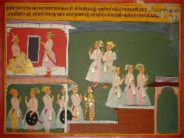 | Description / विवरण | Miniature painting based on Prithviraj Raso depicting Prithviraj talking with a noble. In the painting the lady asks the Karan about Chandra and Karan tells that Chandra is like a guru for Prithviraj. On the painting five nobles are seen in the left side. |